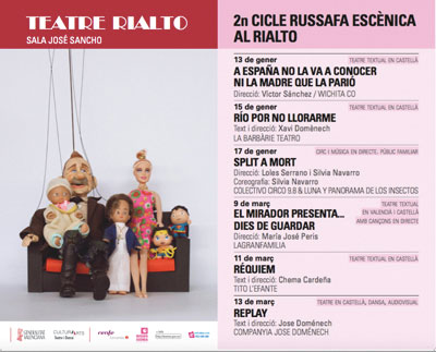 El II Ciclo de Russafa Escènica en el Rialto se pone en marcha por segundo año consecutivo con la colaboración con CulturArts. En esta segunda edición la Sala José Sancho del teatro valenciano acogerá las propuestas que se crearon para ser representadas en espacios no convencionales del barrio como peluquerías, talleres o galerías de arte y cuya temática gira entorno a las «Familias», lema de Russafa Escènica 2015. De esta forma, las obras que componen el ciclo han sido readaptadas para responder al esquema propio del teatro a la italiana, lo que supone para las compañías participantes una oportunidad de consolidar sus propuestas y de abrirse a un nuevo público.