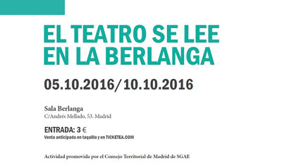 La Fundación SGAE, a través del Consejo Territorial de la SGAE en Madrid, ha organizado la segunda edición del ciclo de lecturas dramatizadas ‘El teatro se lee en la Berlanga’, del 5 al 10 de octubre en Madrid.