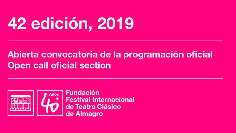 La Fundación Festival Internacional de Teatro Clásico de Almagro abre la convocatoria para la presentación de propuestas para la programación oficial de la 42 edición del Festival de Teatro Clásico de Almagro. Estas propuestas pueden presentarse desde hoy y podrán recibirse hasta el 3 de febrero de 2019. Podrán concurrir todas las compañías, nacionales e internacionales, cuyo trabajo esté basado, inspirado o ponga en escena, fundamentalmente, textos del Siglo de Oro en español.