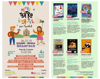 La sala Bilborock de Bilbao acogerá 6 obras de pequeño formato que, bajo temática navideña, serán representadas del 26 al 28 de diciembre. La iniciativa pretende acercar este nuevo formato de teatro a los niños y niñas de la ciudad. Los montajes de 15 minutos permitirán que los más pequeños se adentren y formen parte de las propias obras de teatro.
