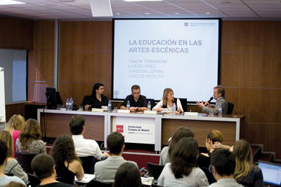La Universidad Europea de Madrid reunió el pasado 7 de abril en su mesa redonda ‘La educación en las Artes Escénicas’ al director general de la red de teatros ARTERIA, Luis Álvarez, al autor teatral Jordi Galcerán y al actor Carlos Hipólito. El encuentro ha estado moderado por la directora de teatro y coordinadora del Grado en Artes Escénicas y Mediáticas de la Universidad Europea de Madrid, Tamzin Townsend, que se refirió a los invitados como ‘todas las piezas necesarias para crear una obra: un buen texto, un buen reparto y una dirección razonable’. Enmarcado dentro de la última jornada de la Semana de la Comunicación, el evento comenzó con la intervención de Luis Álvarez, que felicitó a la universidad por ser una de las primeras en España en crear un Grado de Artes Escénicas. Por su parte, Carlos Hipólito mostró su satisfacción al respecto: ‘Me da envidia que actualmente se pueda estudiar teatro en la universidad y que además esta formación sea valorada porque muchos no tuvimos esa oportunidad’. También Townsend quiso dar a conocer su experiencia y aludió al momento en que llegó a España: ‘No podía creer que no hubiese grados teatrales’.