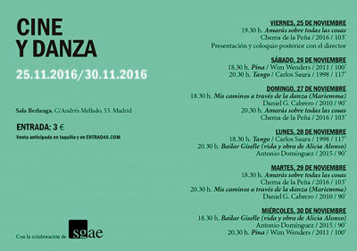 La Fundación SGAE ha organizado el ciclo Cine y Danza del 25 al 30 de noviembre en la Sala Berlanga de Madrid. La muestra tiene como objetivo vincular la coreografía con el audiovisual a través de una selección de obras producidas en las últimas dos décadas. En concreto,’ Amarás sobre todas las cosas’ de Chema de la Peña; ‘Pina’ de Wim Wenders; ‘Tango’ de Carlos Saura; ‘Mis caminos a través de la danza (Mariemma)’ de Daniel G. Cabrero; y ‘Bailar Giselle (vida y obra de Alicia Alonso)’ de Antonio Domínguez.