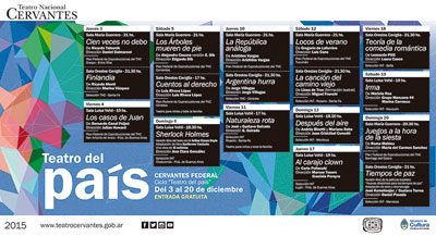 El 3 de diciembre se inicia una nueva edición del Ciclo Teatro del País que cada año organiza el Teatro Nacional Cervantes como cierre de su programa Cervantes Federal. Esta fiesta teatral permite al público de Buenos Aires conectarse con las producciones de los artistas de las provincias argentinas.