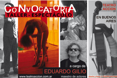 Teatro Acción de Buenos Aires abre la convocatoria para quienes quieran cursar el Taller a cargo de Eduardo Gilio, durante el cual se seleccionarán de entre los alumnos los integrantes de un nuevo espectáculo. Teatro Acción, fundado y dirigido por Eduardo Gilio, es un grupo profesional que funciona como laboratorio de experimentación teatral.