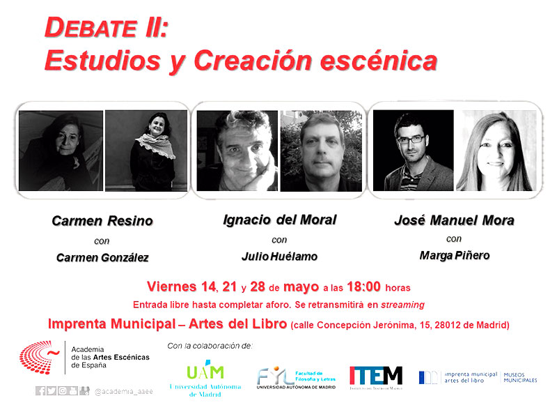 Dada la aceptación que esta actividad cosechó en su primera edición, la Academia de las Artes Escénicas de España pone en marcha la celebración de los ‘Debate II: Estudios y creación escénica’, una actividad coordinada por la delegada de la especialidad Marga Piñero con la participación de la académica Carmen González Vázquez (UAM) y Diego Santos (ITEM) y con la colaboración J.M. Marín Perellón, director de la de la Imprenta Municipal – Artes del Libro del Ayuntamiento de Madrid.