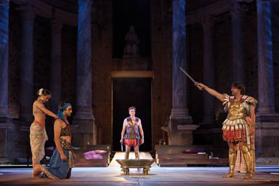 La programación del espacio principal, el Teatro Romano de Mérida, ha tomado forma con obras de teatro de nueva creación respetando la esencia grecolatina del evento. Se han podido ver títulos como ‘La décima musa’, con dramaturgia de Guillem-Jordi Graells; ‘Alejandro Magno’, de Jean Ranice en versión libre de Eduardo Galán y Luis Luque; ‘Los hilos de Vulcano’, con dramaturgia de Marta Torres; ‘Aquiles, el hombre’ de Roberto Rivera; ‘La guerra de las mujeres (Lisístrata)’, de Miguel Narros; ‘Los Pelópidas’, de Jorge Llopis en versión de Florián Recio; ‘Marco Aurelio’, de Agustín Muñoz Sanz en versión de Miguel Murillo; y el concierto 15 Sinfónico, de Ara Malikian.