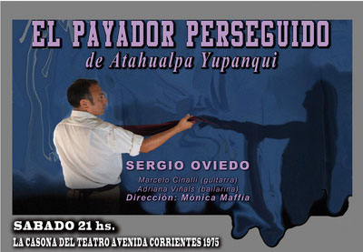 Con motivo de las celebraciones por el cumpleaños de Atahualpa Yupanqui, se presentará el día 13 de febrero en La Casona de Buenos Aires una representación de ‘El Payador Perseguido’ del propio Atahualpa Yupanqui con Sergio Oviedo y con el guitarrista Marcelo Cinalli, la bailarina Adriana Viñals y la forografía de Iris Maffía. La obra cuenta con la dramaturgia y la dirección general de Mónica Maffía.