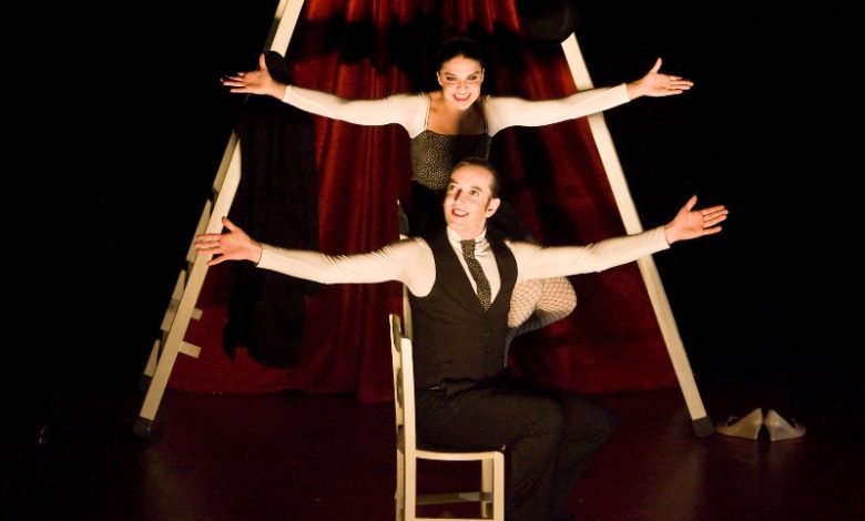 ‘Artistas o Bestias‘ ofrece al espectador un espacio para volar con las palabras, palabras que anidan en nuestro imaginario y que, en escena, resuenan como una invitación a soñar despiertos. El juego teatral se vuelve espectáculo y magia en esta pista semicircular, donde dos personajes, dos artistas, una mujer y un hombre, una pareja habla consigo misma, con el público sentado en sus butacas, y con su pasado. El circo nos invita a la fiesta en un escenario abierto, e íntimo a la vez. El rojo carmín, el telón viejo y una escalera como una carpa imaginada, pulmón gigante que nos acoge, nos convierten en espectadores de un circo tal vez soñado. Dos sillas, mucho más que dos muebles, viven en escena con estos dos personajes de carne y hueso. Teatro y circo, danza, ironía y juego se despliegan en un tiovivo reconocible y añorado, un espacio para la ilusión y la poesía. ¿Quién no ha deseado salir volando? ¿Quién no se ha sentido enjaulado? ¿Quién no busca el aplauso? ¿Quién no vive en la cuerda floja? Pasen y vean.