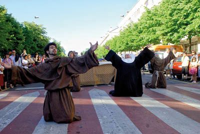 ‘Habitus Mundi’ es una divertida propuesta en la que un grupo de monjes que salen a la calle a evangelizar al mundo acaban seducidos por el mundo del cabaret. La obra es un espectáculo de calle puro que combina itinerancia, improvisación, música, coreografía y participación del público en la estela de ‘Business Class’ (2008), anterior y aplaudido espectáculo de Nacho Vilar Producciones. De hecho, ‘Habitus Mundi’ está también dirigido por Antón Valén (Cieza, 1965), profesional con una larga trayectoria en el mundo del clown que en 2002 fue seleccionado por Slava Polunin para trabajar en el espectaculo ‘Alegría’ de Cirque du Soleil. Valén co-dirige así mismo la última producción de Nacho Vilar, ‘Don Quijote, Alcohólicos Anónimos y otros’, estrenada en el Festival Internacional de Teatro y Danza de San Javier con notable éxito de crítica y público.
