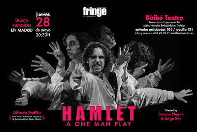 El clásico de Shakespeare, Hamlet, llega a Biribó Teatro bajo la dirección de Simone Negrín y Jorge Rey, ambos formados en Argentina, antes de su estreno en el Festival Fringe de Edimburgo. El escritor Alfredo Conde, Premio Nacional de Literatura y Premio Nadal, es el encargado de la traducción al castellano para su montaje sobre las tablas de España. La función comienza por el final; Hamlet muere y le pide a su amigo Horacio que cuente su historia. Es él quién recibe a los espectadores y relata los hechos que han sucedido, de los que ha sido testigo, encarnando a los principales personajes de la misma: Hamlet, El Rey, El Fantasma del Padre, Polonio, La Reina y Ofelia. ‘Hamlet, one man play’, sólo podrá verse en Madrid el 28 de Mayo en Biribó Teatro.