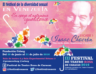 Del 30 de junio al 31 de julio se realizará, con la participación de dieciocho agrupaciones, la 3ª edición del Festival de Teatro Rosa de Caracas, organizado por la agrupación Teatro Tracodra. El festival está dedicado a la diversidad sexual, en homenaje al dramaturgo venezolano Isaac Chocrón, quien orgullosamente decía «soy zurdo, judío y homosexual».