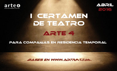 La escuela privada de interpretación arte4 estudio de actores, de Madrid, convoca su I Certamen de teatro para compañías en residencia temporal. El certamen está destinado a intérpretes profesionales graduados en cualquier escuela de arte dramático. De los proyectos presentados se seleccionarán entre 3 y 8 propuestas que dispondrán de un año para la preparación de su puesta en escena y su posterior estreno en la sala de arte4. El plazo de presentación de los proyectos finaliza el 27 de febrero de 2015.