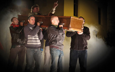 La programación de las Jornadas Monstrenkas 2014 comienza el 20 de diciembre en la trasera de la EScuela Intantil Infantil Municipal Haurtzaro (a 50 metros de la Sala Monstrenka) con el espectáculo ‘Entre lombirces’ de Kolectivo Monstrenko & Zanguango Teatro. La obra pone en escena la es la retrasmisión en directo de una muerte, la de José Javier Navaridas Tinglado, un actor fracasado que no ha encontrado mejor forma de hacerse famoso que la de sumarse al proyecto que le propone su visionario y excéntrico manager, Alfredo Bonaparte, y que no es otro sino enterrarse vivo y retrasmitir sus impresiones del tránsito a la muerte a dos metros bajo tierra. ‘Entre lombrices’ es un espectáculo interactivo que posteriormente el público podrá seguir a través de las redes sociales -Twitter, Facebook, YouTube- y del canal www.entrelombrices.com, donde se narraran las experiencias y descomposiciones (físicas y mentales) del enterrado José-Ja, en directo y sin cortes.