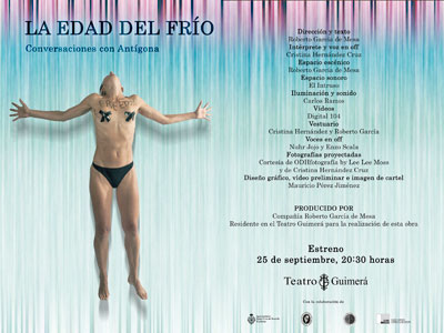 Con texto y dirección de Roberto García de Mesa, por el poema escénico ‘La edad del frío. Conversaciones con Antígona’ transitan algunas ideas que intervienen en la historia emocional de los seres humanos. El desencanto de la política o el debate sobre diferentes temas fundamentales (la incertidumbre, el papel de Europa, la libertad de expresión, la intolerancia, la corrupción, el canibalismo del sistema, las utopías, etc.), todo ello expresado con un lenguaje escénico contemporáneo, a través de diversas formas, son algunos de los asuntos que navegan por esta pieza interpretada por Cristina Hernández Cruz.