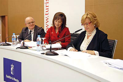 Durante el acto, que se ha celebrado en el stand institucional de Castilla-La Mancha en Fitur, también han estado presentes el consejero de Ordenación del Territorio y Vivienda, Julián Sánchez Pingarrón; el presidente de las Cortes regionales, Francisco Pardo y el presidente de la Diputación Provincial, Pedro Antonio Ruiz Santos.