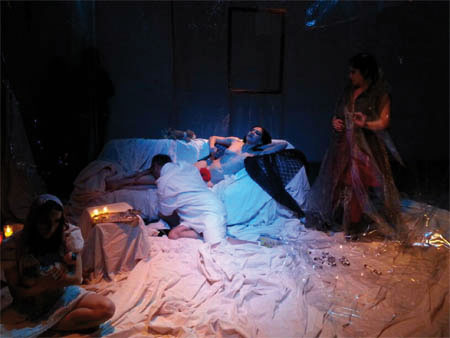 ‘La obra ‘Lucientes (¿Sois almas en pena o sois hijos de puta?)’ de La Intemerata se vale de la unión de lenguajes como la música en vivo, la danza, la performance, la actuación y el medio audiovisual, para plantear una acción concreta en la vida del gran artista Goya: la última noche en la Quinta del sordo antes de exiliarse a Burdeos. La compañía parte del Capricho número 43: El sueño de la razón produce monstruos para mostrar una serie de pesadillas que se producen esa noche en la mente del artista y el espacio que habita en la Quinta del sordo.