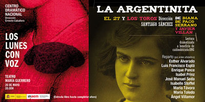 La lectura dramatizada de la obra de Diana de Paco Serrano y Javier Villa, ‘La Argentinita: el 27 y los toros’ se realizará hoy, 26 de mayo a las 20.00 horas en el Teatro María Guerrero de Madrid bajo la dirección de Santiago Sánchez. La lectura será interpretada por Esther Alvarado, Luis Francisco Esplá, Enrique Ponce, Isabel Prinz, José Manuel Seda, Isabelle Stoffel, María Távora, MAría Toledo y Ángel Villamor.