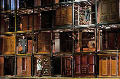 La escenografía desempeña un papel importante en este montaje, con una gran construcción de 9 metros que contiene 28 armarios que abren y cierran sus puertas.