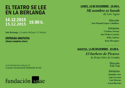 El ciclo de lecturas dramatizadas ‘El teatro se lee en la Berlanga’ concluye con la representación de las obras ‘Mi nombre es Sarah’ y ‘El barbero de Picasso’, los días 14 y 15 de diciembre, respectivamente, a las 19:00 horas en la Sala Berlanga de Madrid. La muestra está organizada por la Fundación SGAE y promovida por el Consejo Territorial de la SGAE en Madrid.