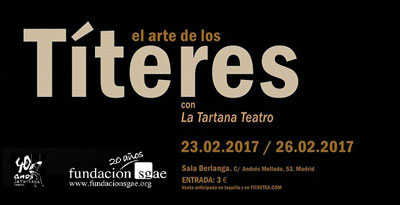 La Fundación SGAE celebra los 40 años de la compañía La Tartana Teatro con el ciclo ‘El arte de los Títeres’, que tendrá lugar del 23 al 26 de febrero en la Sala Berlanga de Madrid. La muestra ofrecerá durante cuatro días una serie de actividades que profundizan en el mundo del títere, las marionetas y los autómatas con el propósito de reivindicar el valor artesano de esta disciplina escénica.