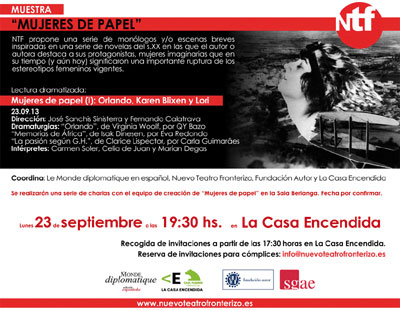 NTF (Nuevo Teatro Fronterizo) ha organizado para el 23 de septiembre «Mujeres de papel», una muestra de monólogos y escenas breves que se representarán en La Casa Encendida de Madrid a partir de las 19.30.