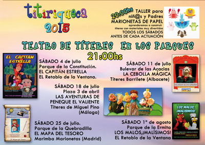 Titiriqueca, que está organizado por el CiTi (Circuito de títeres del Henares) y patrocinado por la Concejalía de Cultura – Ayuntamiento de Azuqueca de Henares (Guadalajara, España), cuenta con un programa que se desarrollará todos los sábados del 4 de julio al 1 de agosto en diferentes parques de la cuidad. El festival contará con la participación de grupos de títeres de Albacete, Malaga, Madrid y Guadalajara.
