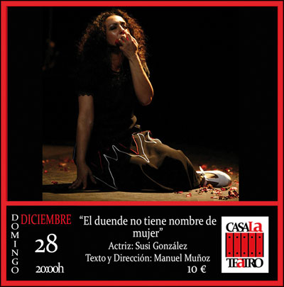 La actriz Susi González interpreta la obra ‘El duende no tiene nombre de mujer’, espectáculo que trata sobre la vida de la cantaora flamenca Pastora Pavón, conocida como ‘La niña de los peines’. El espectáculo, con guión y dirección de Manuel Muñoz Bellerin, es un monólogo que consta de tres actos. Cada acto representa una parte de la vida del personaje: infancia, vida adulta y artística y senectud. La obra se podrá ver el día 28 de diciembre a las 20,00 h. en La Casala Teatro en el mercado de Triana (Sevilla).