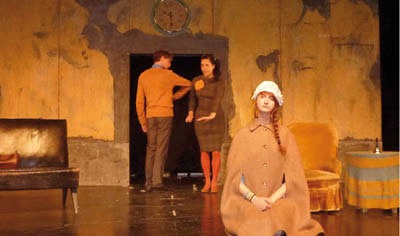 ‘La cantante calva’ que presenta el Grupo de Teatro de la Universidad de Cantabria se desarrolla en un espacio escénico ecléctico, basado en el reciclaje y el aprovechamiento de recursos existentes, ambientado en la década de los 50. La puesta en escena quiere poner de relieve las contradicciones de la clase representada en la obra y, en este sentido, se vale de unos elementos escenográficos deteriorados se resalta el mundo de las falsas apariencias donde habitan los personajes y con el vestuario de los matrimonios protagonistas, de alguna manera opuesto a la escenografía, se destaca la perdida de identidad. El resto de elementos escénicos, como la luz o el espacio sonoro adquieren vital importancia para transportarnos al mundo onírico de los personajes.