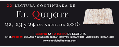La tradicional Lectura Continuada del Quijote celebra en 2016 su vigésima edición, que tendrá lugar del 22 al 24 de abril en la Sala de Columnas del Círculo de Bellas Artes de Madrid. A lo largo de cuarenta y ocho…