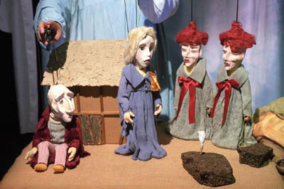 Por una escenografía de montañas y castillos, una atmósfera de cuento, se pasean unas hermosas marionetas manipuladas a la vista.