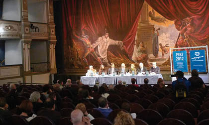 La celebración del aniversario, que el coliseo municipal ha organizado con la denominación 25 años dando el espectáculo, fue presentada por el alcalde de Málaga, Francisco de la Torre; el concejal de Cultura, Damián Caneda, y la directora-gerente del Cervantes, Charo Ema. El académico Antonio Garrido Moraga, coordinador del libro 25 años en escena. 1987-2012; Manuel Jiménez, director de El pésimo actor mexicano; José Antonio López Ortega, secretario de la Orquesta Sinfónica Provincial, y Francisco Sotomayor, presidente del Coro de Ópera, también formaron parte de la mesa, que se instaló en un escenario que para esta ocasión especial tenía como fondo el telón de boca original que realizó Bernardo Ferrándiz en el XIX. De la Torre y Caneda anunciaron la próxima restauración del lienzo de Ferrándiz, una obra de pleno estilo decimonónico en el que se citan literalmente los nombres de Esquilo, Lope de Vega, Tirso de Molina, Calderón y Moratín, y cuyos méritos estéticos y sus alegorías de las artes escénicas describió Antonio Garrido. Después de detallar a los medios todos los actos del cumpleaños, el alcalde inauguró la muestra ‘1951-1961. Una década autografiada’, que está instalada desde hoy en diversas dependencias del teatro y que recorrerá los distritos de la ciudad desde mediados de abril hasta julio.